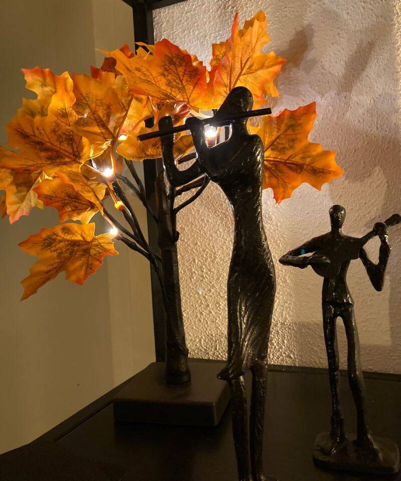 Het herfstboompje kocht ik ooit bij de Action. Jaren geleden kocht ik de gietijzeren beeldjes op een Nederlandse kerstmarkt. Ze waren toen 5 euro per stuk. Dat weet ik nog. Ik zou er eigenlijk nog wel meer willen hebben. Laatste las ik ergens dat ze verkocht worden op Duitse kerstmarkten. Hoewel ik er verder niets te zoeken heb, zou ik hiervoor wel eens willen kijken. Maar op dit moment kan ik elke avond genieten van dit herfsttafereeltje. Onze metalen kast hebben we nog niet zolang. En ik vind dat het erg leuk staat zo.