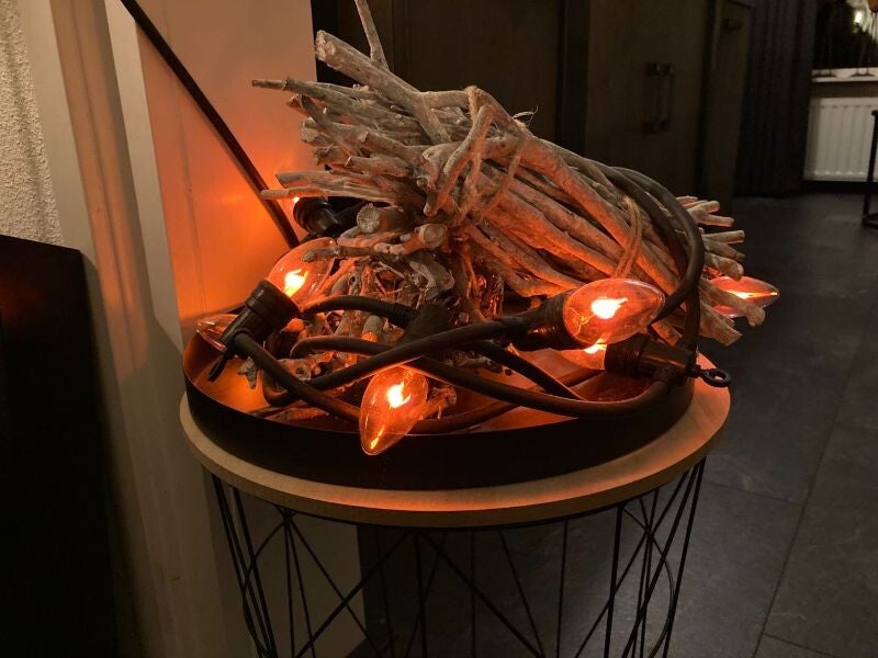 Vorig jaar kocht ik deze leuke haardlampjes bij Tuinland. Best prijzig, maar ik geniet ervan. De takken kocht ik bij Action. De mand kreeg ik per verrassing van manlief op mijn verjaardag. Het hele jaar heb ik het laten staan. Op koude avonden doe ik de verlichting aan. De vlammetjes flikkeren zo gezellig! Ik krijg er veel complimenten over.